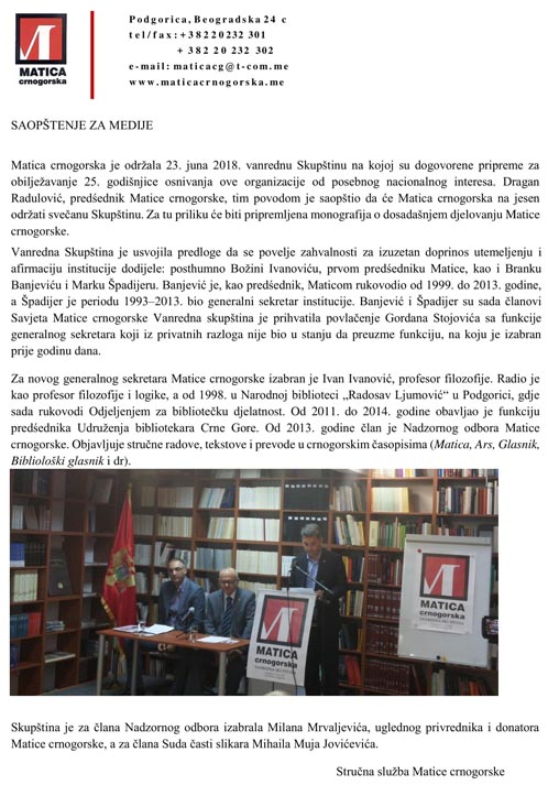 Matica crnogorska se s tugom i nevjericom oprašta od svoje prijateljice i dugogodišnje saradnice, istaknute crnogorske dramske umjetnice Ivane Mrvaljević.